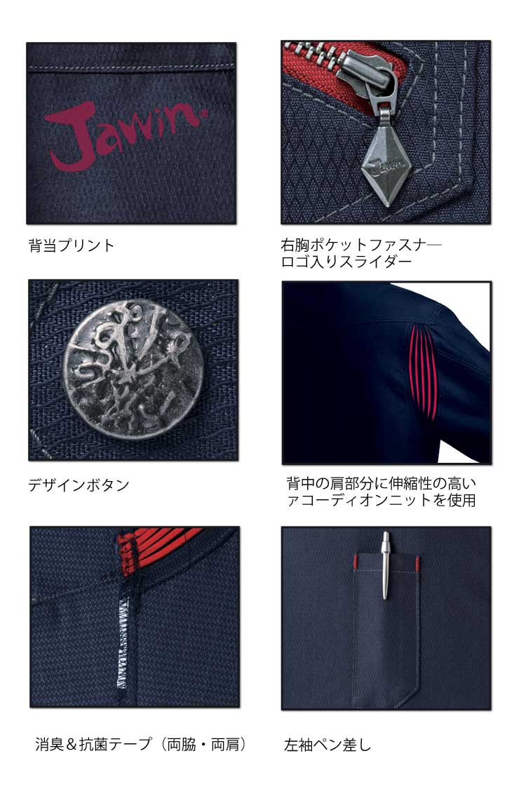 商品説明: Jawinの作業服52300シリーズです。デザイン性と機能性を兼ね備えた至極の一着です。アシンメトリーデザインとツインファスナーがハード感を演出。伸縮性の高いアコーディオニットとダイヤ柄が特徴の丈夫な素材を使用した、デザイン性と機能性を兼ね備えたシリーズです。