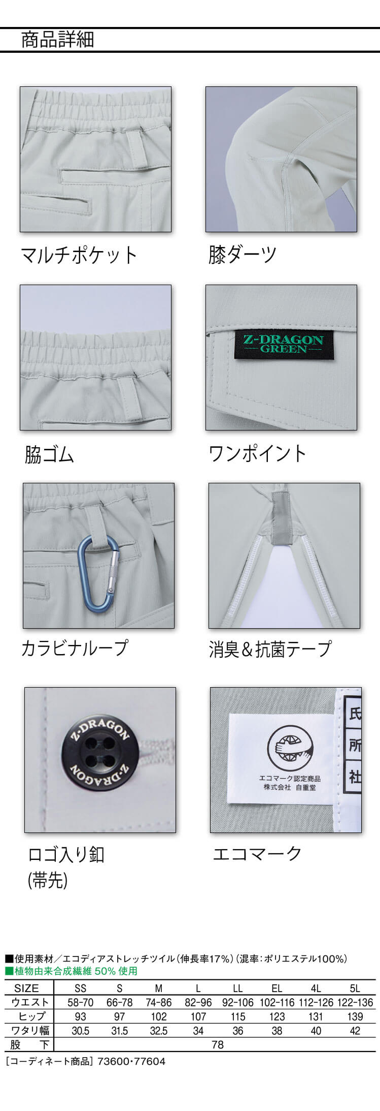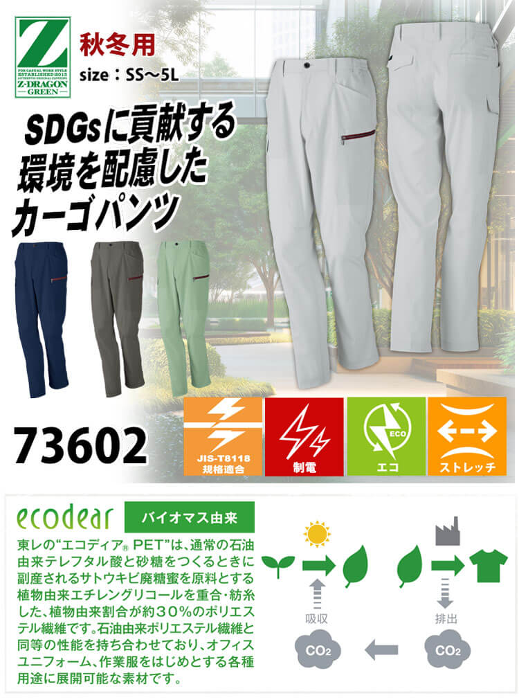 製品名: ジードラゴン Z-DRAGON エコ製品制電ストレッチノータックカーゴパンツ 73602 作業着 SDGs 環境配慮型 秋冬 自重堂