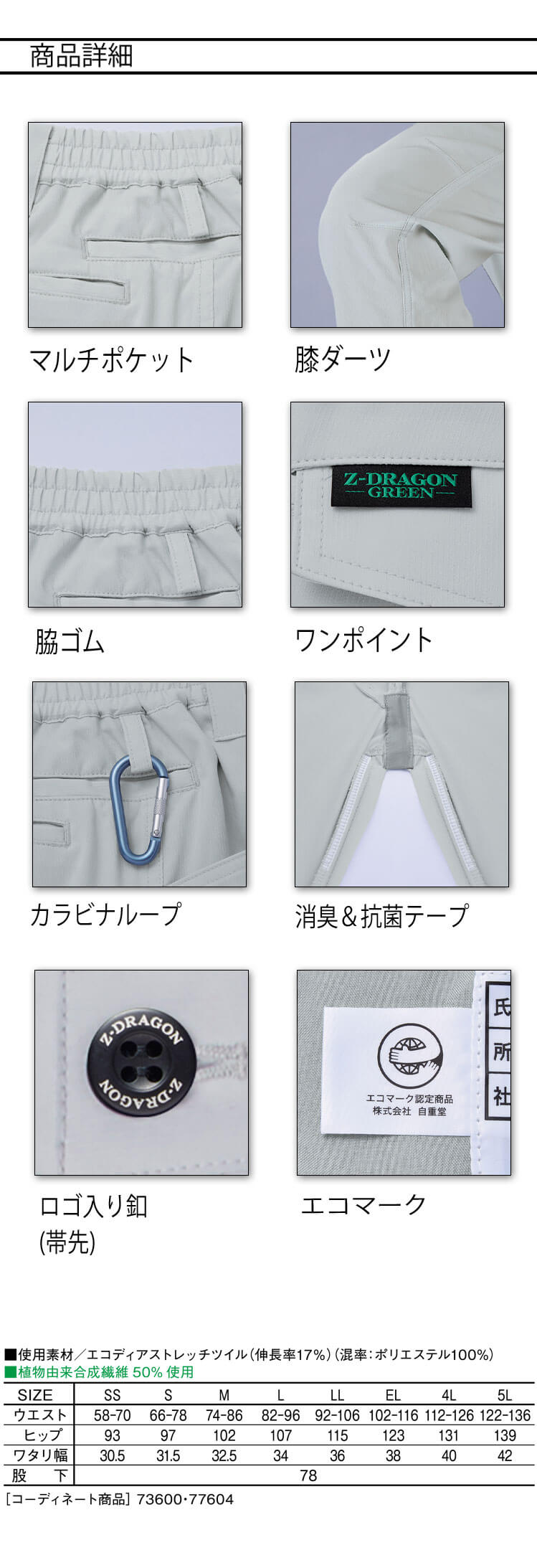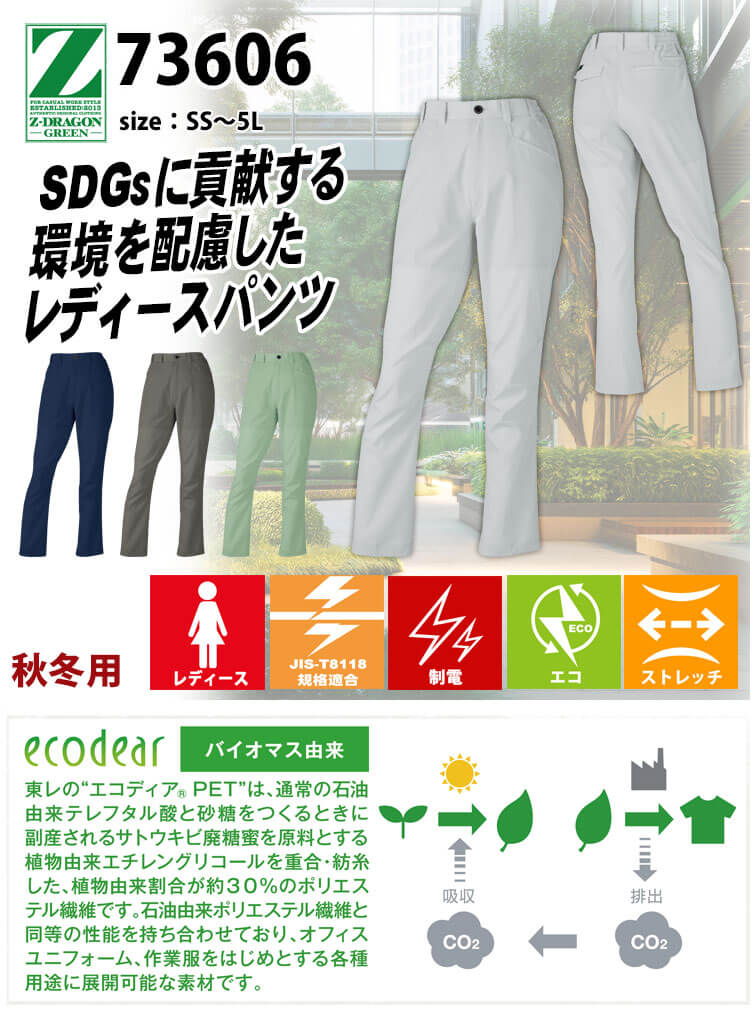 製品名: ジードラゴン Z-DRAGON エコ製品制電ストレッチレディースパンツ 73606 作業着 SDGs 環境配慮型 秋冬 自重堂