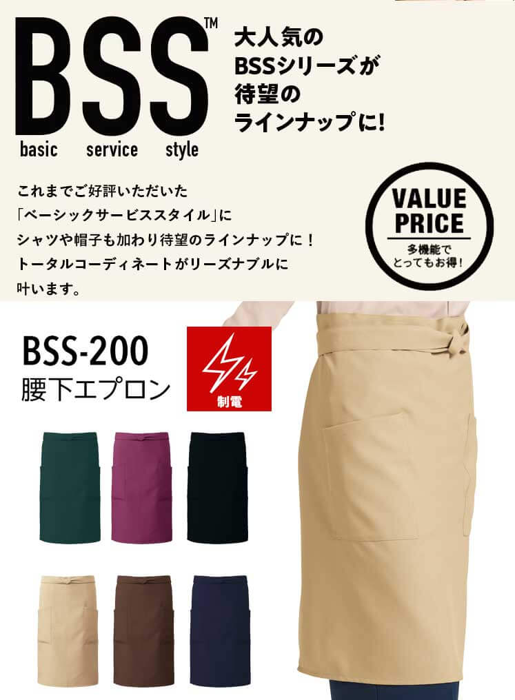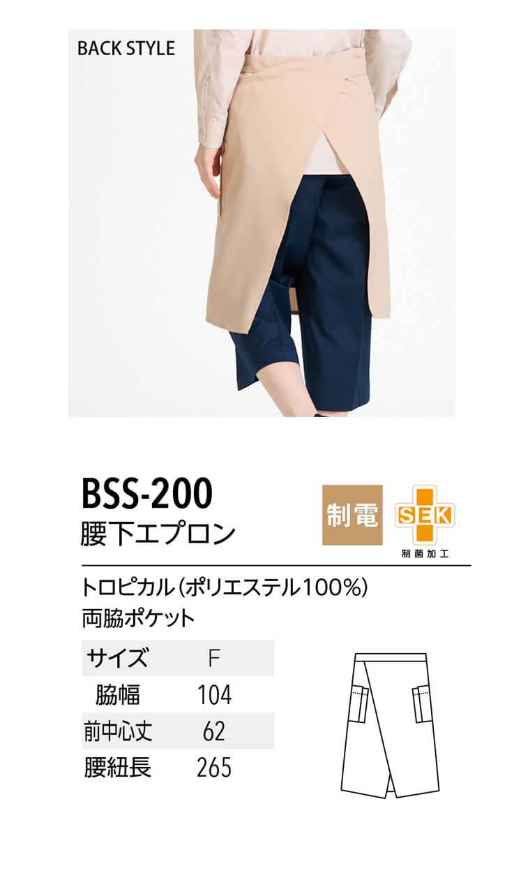 商品説明: BSSシリーズ 腰下タイプのショートエプロン。カラーも6色と豊富なバリエーション。ショート丈(前中心丈62センチ)で足さばきが良く、動きやすい。両脇ポケットでペンやメモなどの小物類をバッチリ収納できます。生地には丈夫でハリのある「トロピカル」を使用。軽い生地なので使い勝手も良く、お手入れもラクです。シンプルなデザインだからこそ、幅広い場面でも活用することができ、同じBSSシリーズと合わせることでトータルコーディネートが可能です。