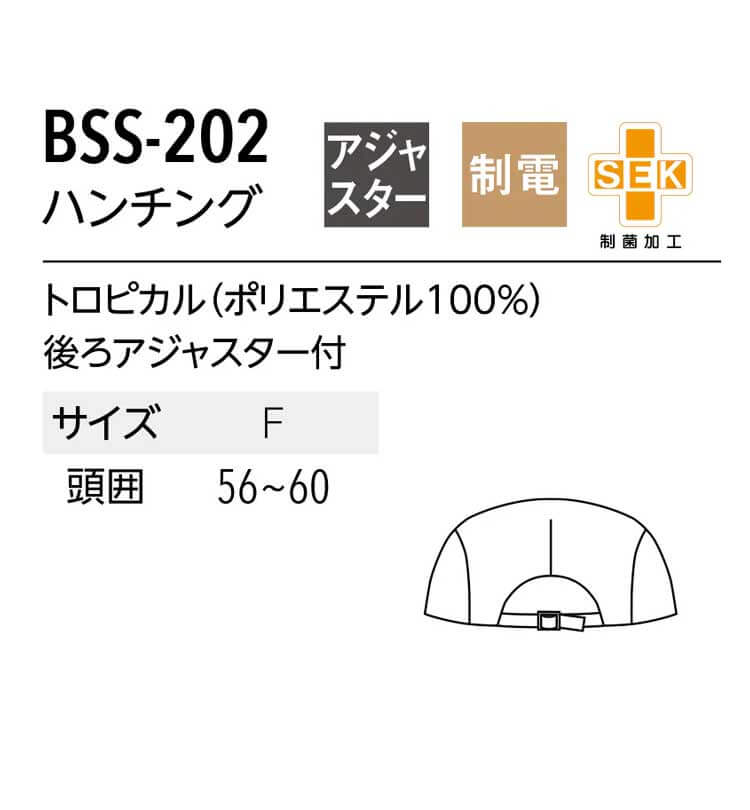商品説明: BSSシリーズ ハンチング帽。後ろアジャスターでサイズ調節(56~60センチ)もバッチリ。カラーも6色と豊富なバリエーション。同じBSSシリーズと合わせることでトータルコーディネートが可能です。また生地には丈夫でハリのある「トロピカル」を使用しており、軽い生地なので使い勝手も良く、お手入れもラクです。