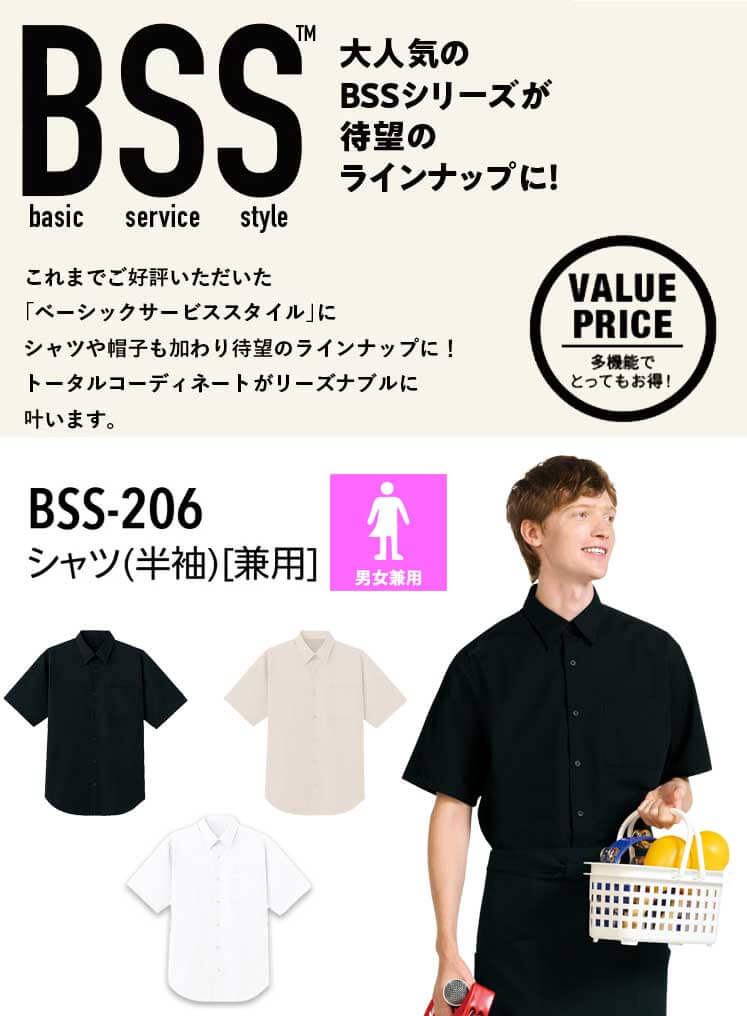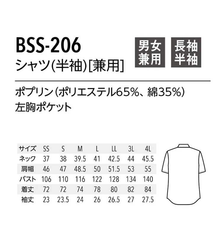 商品説明: BSSシリーズ 半袖シャツ。シンプルなデザインの定番シャツです。SS~4Lと豊富なサイズ展開で、 同じBSSシリーズのエプロンなどと合わせることでトータルコーディネートが可能です。