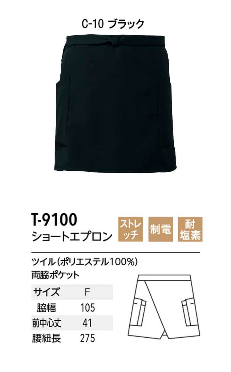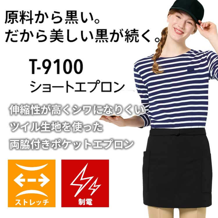 商品説明: T9100は「原着糸」を使用した「KEEP BLACK」シリーズのショートタイプのエプロンです。「KEEP BLACK」シリーズは原料の段階で着色する「原着糸」を使用しているため、漂白剤に強く、何度洗濯しても色落ちしにくく、また日光でも退色しづらいエプロンとなっています。またツイル生地を使っているため、触り心地も良く、シワになりにくいだけではなく、ストレッチ性も高いため、長時間の着用にもおすすめです。塩素系の漂白剤による退色も抑えられているので、プロフェッショナルな現場でも安心してご使用いただけます。両脇ポケットで小物の収納もすっきり。ヒモ通し用の穴があることで、エプロン装着時のズレも気になりません。ショートエプロンは短め丈で足さばきも快適でブラックカラーがどんな制服とも相性抜群です。