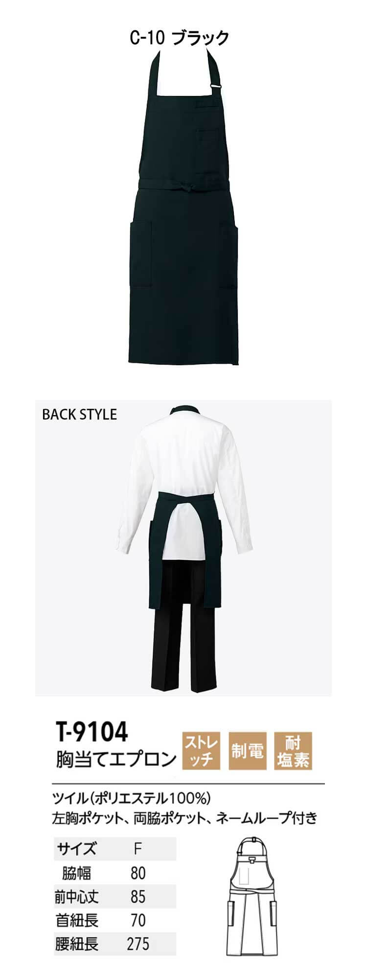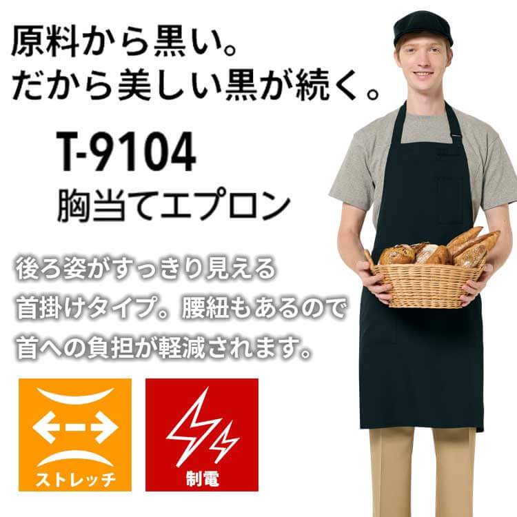 商品説明: T9104は「原着糸」を使用した「KEEP BLACK」シリーズの首掛けタイプの胸当てエプロンです。「KEEP BLACK」シリーズは原料の段階で着色する「原着糸」を使用しているため、漂白剤に強く、何度洗濯しても色落ちしにくく、また日光でも退色しづらいエプロンとなっています。またツイル生地を使っているため、触り心地も良く、シワになりにくいだけではなく、ストレッチ性も高いため、長時間の着用にもおすすめです。塩素系の漂白剤による退色も抑えられているので、プロフェッショナルな現場でも安心してご使用いただけます。左胸ポケットや両脇ポケットで小物の収納もばっちり。首掛けタイプのエプロンなので後ろ姿がすっきり見え、腰ひもがあるので首への負担が軽減されます。