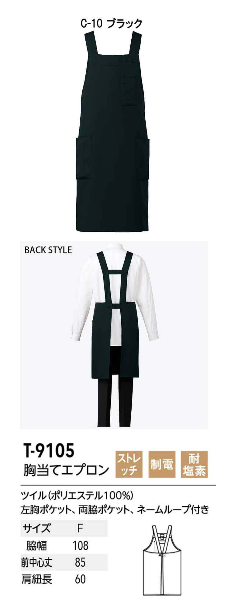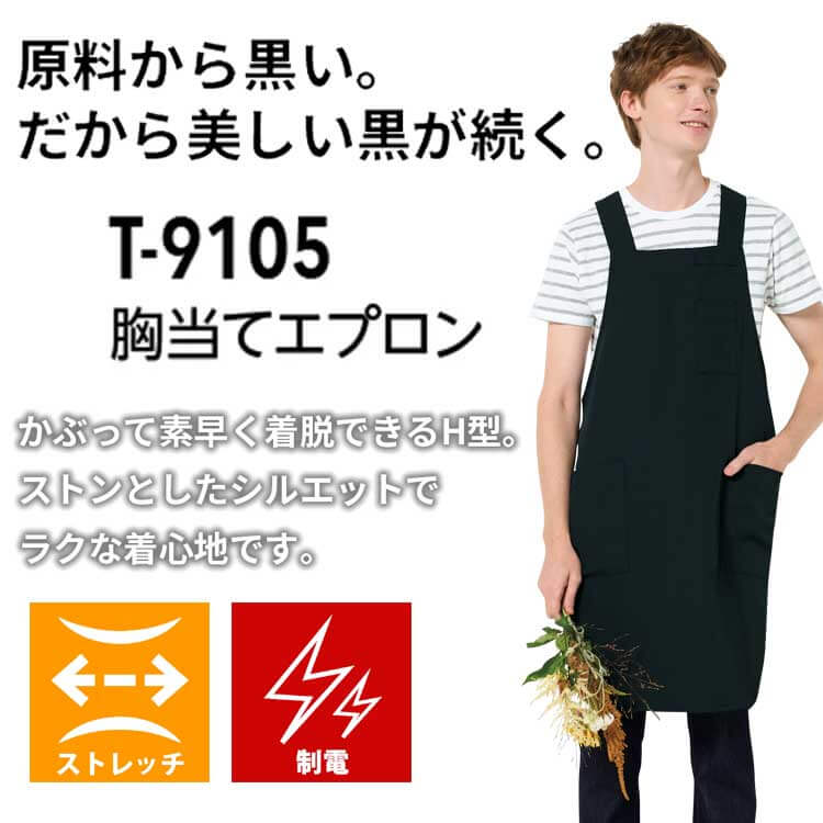 商品説明: T9105は「原着糸」を使用した「KEEP BLACK」シリーズのH型タイプの胸当てエプロンです。「KEEP BLACK」シリーズは原料の段階で着色する「原着糸」を使用しているため、漂白剤に強く、何度洗濯しても色落ちしにくく、また日光でも退色しづらいエプロンとなっています。またツイル生地を使っているため、触り心地も良く、シワになりにくいだけではなく、ストレッチ性も高いため、長時間の着用にもおすすめです。塩素系の漂白剤による退色も抑えられているので、プロフェッショナルな現場でも安心してご使用いただけます。ネームループ付で左胸ポケットや両脇ポケットで小物の収納もばっちり。H型タイプのエプロンなのでかぶって素早く着脱でき、ストンとしたシルエットでラクな着心地です。