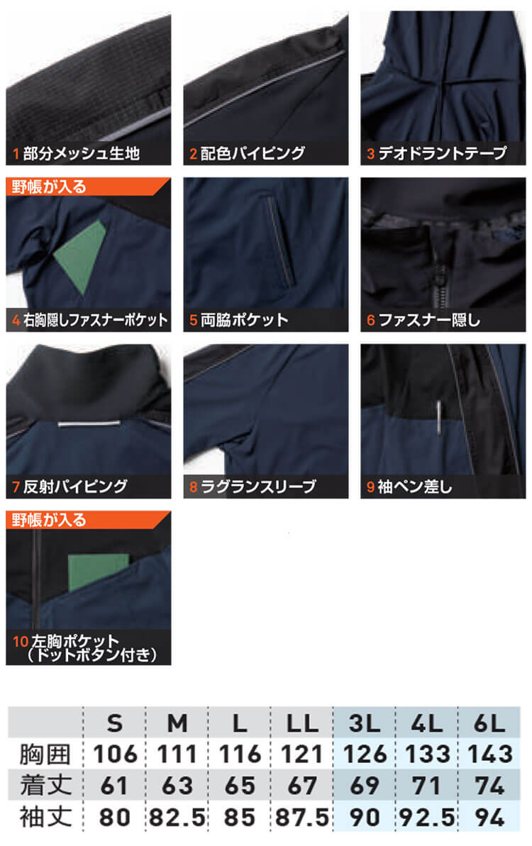 商品説明: 肌に触れた時のひんやり感で夏場でも快適に過ごせる作業服です。動きやすさを追求した高いストレッチ性や部分メッシュ素材使いによる適度な通気性、反射パイピングによる高視認性などハイクオリティな作業服です。