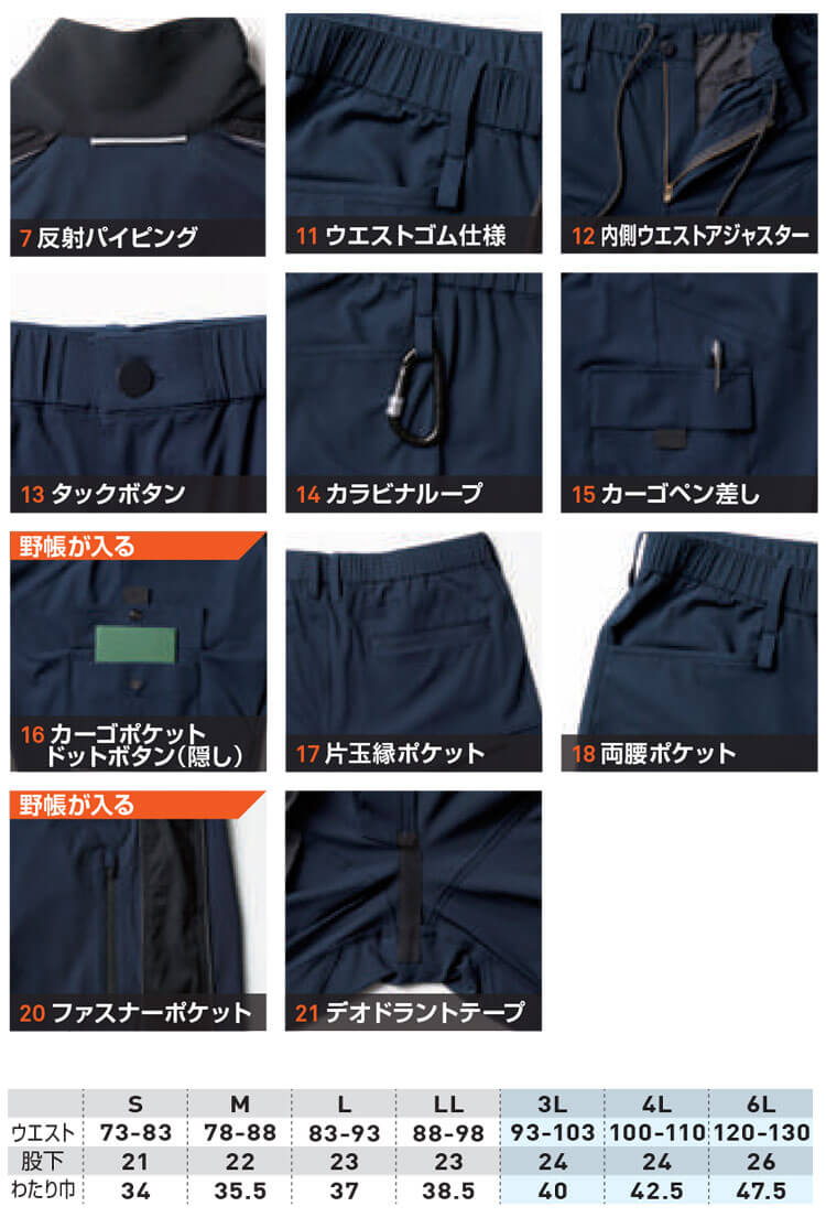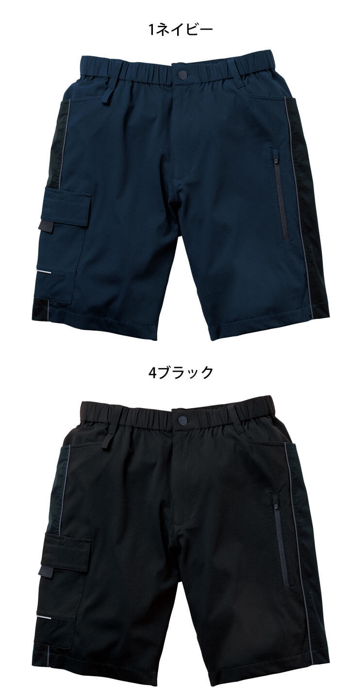 商品説明: 肌に触れた時のひんやり感で夏場でも快適に過ごせる作業服です。動きやすさを追求した高いストレッチ性や部分メッシュ素材使いによる適度な通気性、反射パイピングによる高視認性などハイクオリティな作業服です。