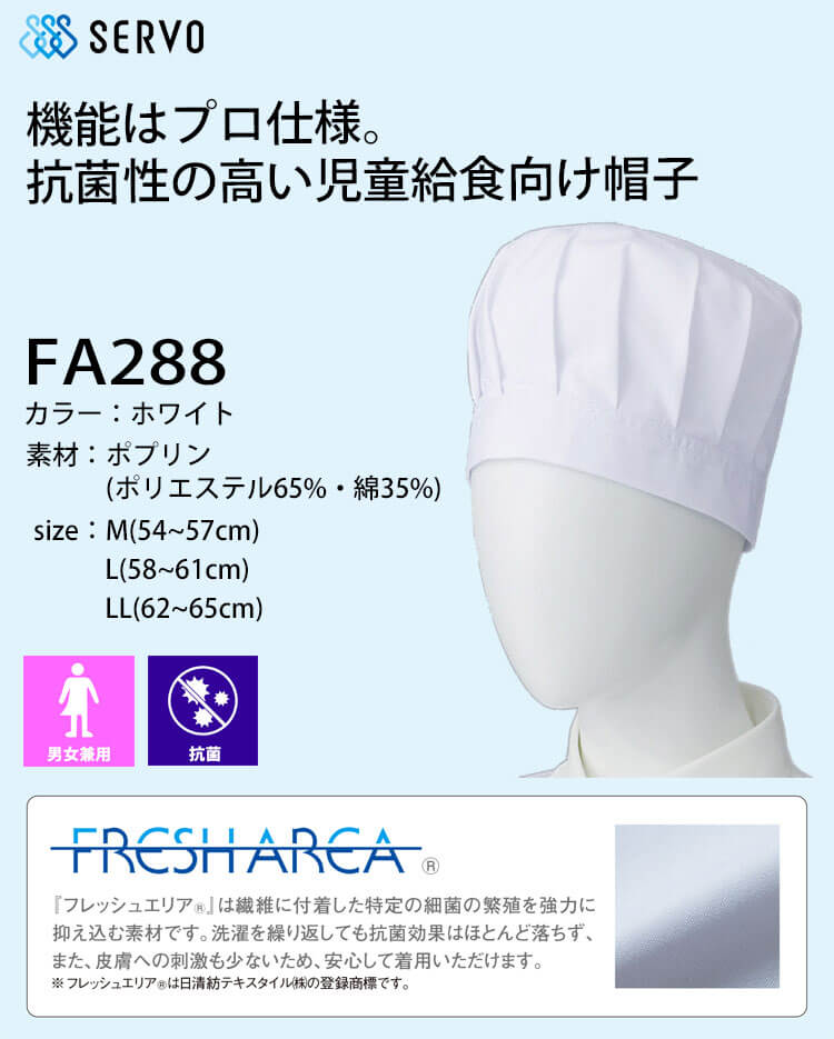• 飲食サービス系ユニフォーム SERVO サーヴォ ツバなし帽子 FA288 男女兼用 給食衣 児童給食