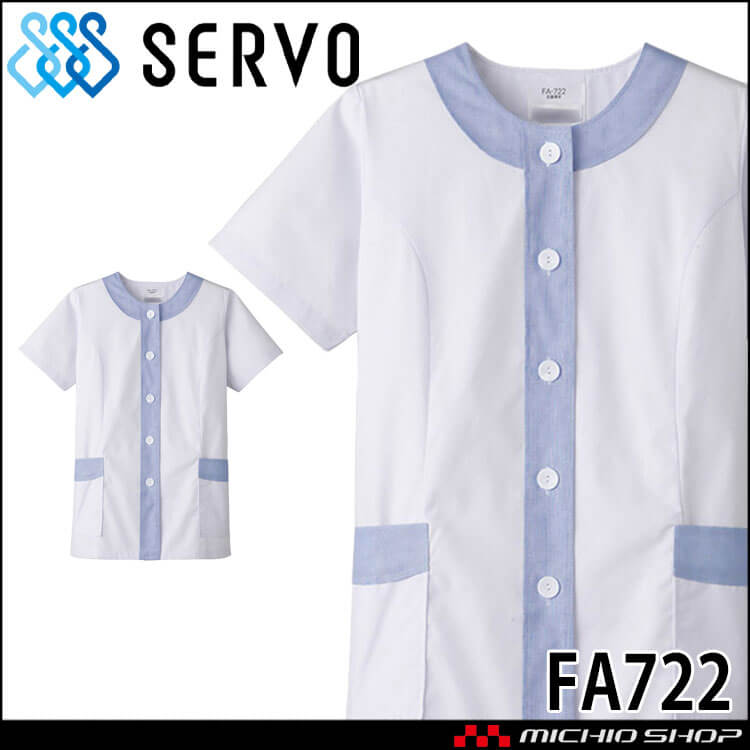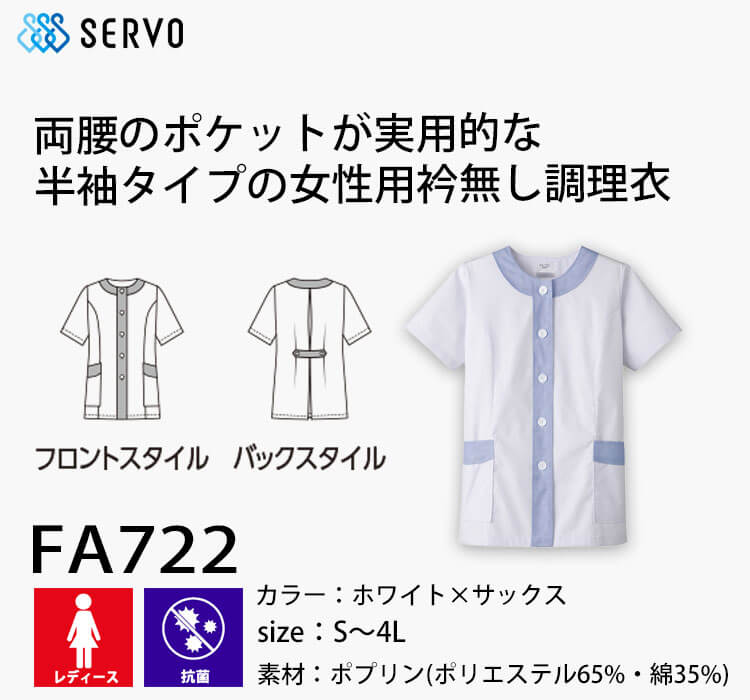 • 飲食サービス系ユニフォーム SERVO サーヴォ 女性用衿無し白衣(半袖) FA722 レディース 飲食店 レストラン カフェ キッチン 制服 ユニフォーム 白衣