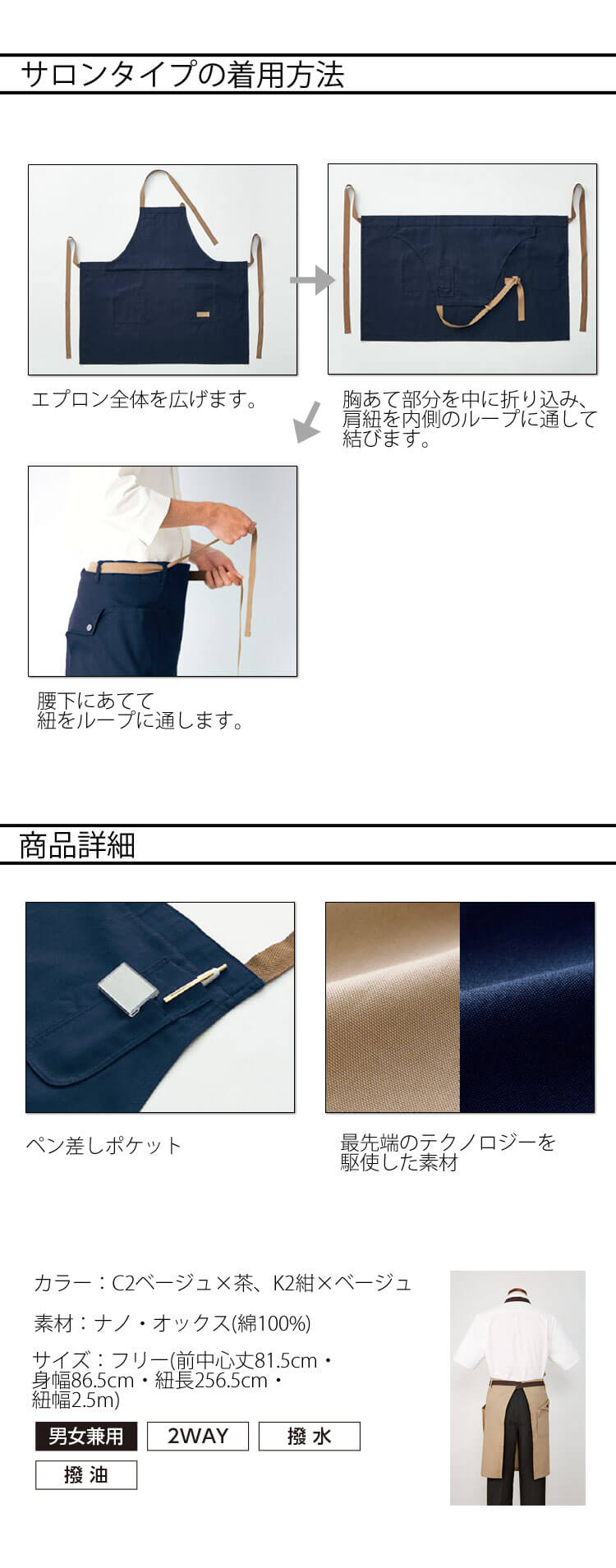 商品説明: サーヴォの胸当てタイプとサロンタイプの2WAYで使えるエプロンです。ナノテクノロジーを応用した素材で、撥水・撥油機能付きです。速乾性、耐久性も高く、しみ込んだ汚れが洗濯で落ちやすいのが特徴です。ソフトな風合いと清潔感のあるカラーも魅力です。左胸にはペン差しがついています。男女兼用で、着用者を選びません。レストランやデリ、ベーカリー、カフェ、スーパーマーケットなどの職場におすすめです。