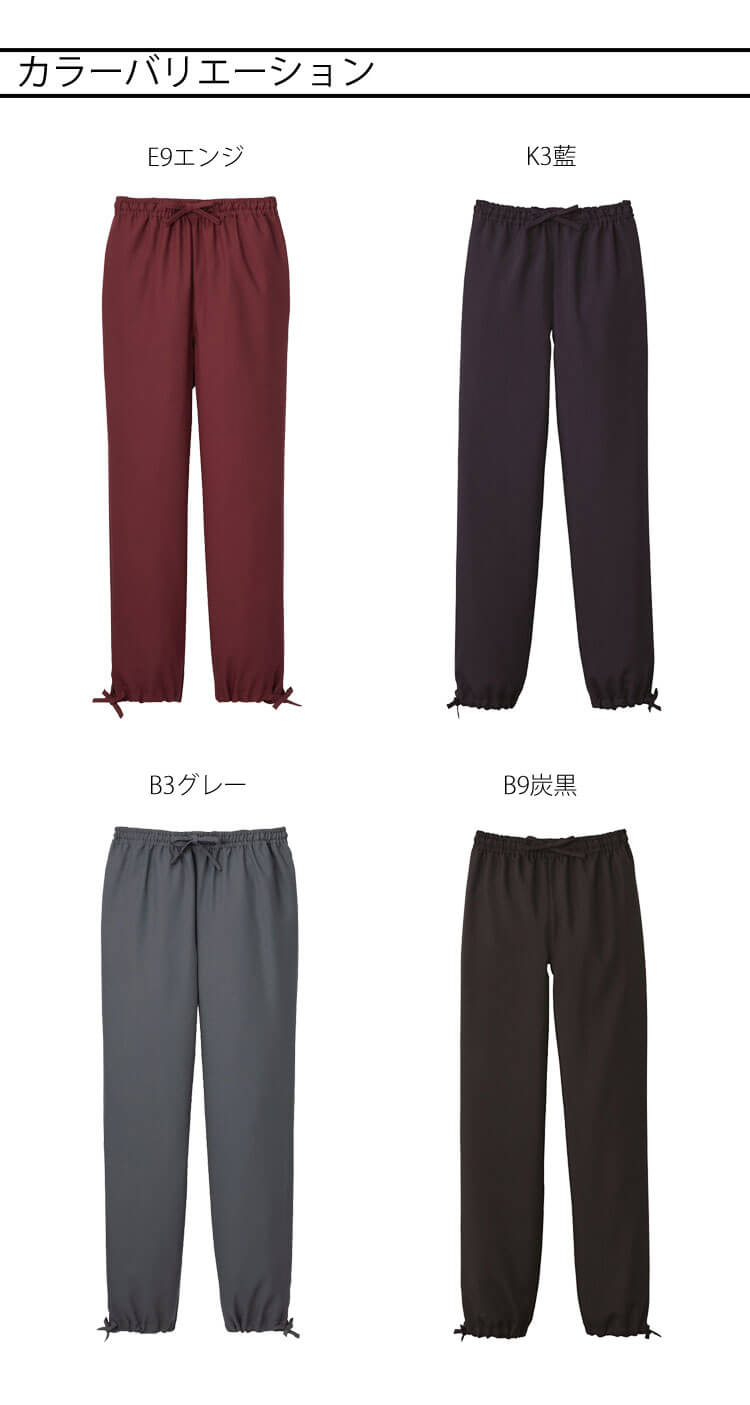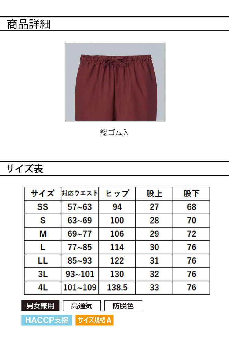 商品説明: サーヴォの豊富なサイズ展開のHACCP支援作務衣パンツです。風通しの良い高通気清涼素材です。強力な防脱色加工で漂白剤や繰り返しの洗濯による退色を防止します。両脇にはポケットが付いています。ウエストは総ゴム入りです。男女兼用で着用者を問いません。