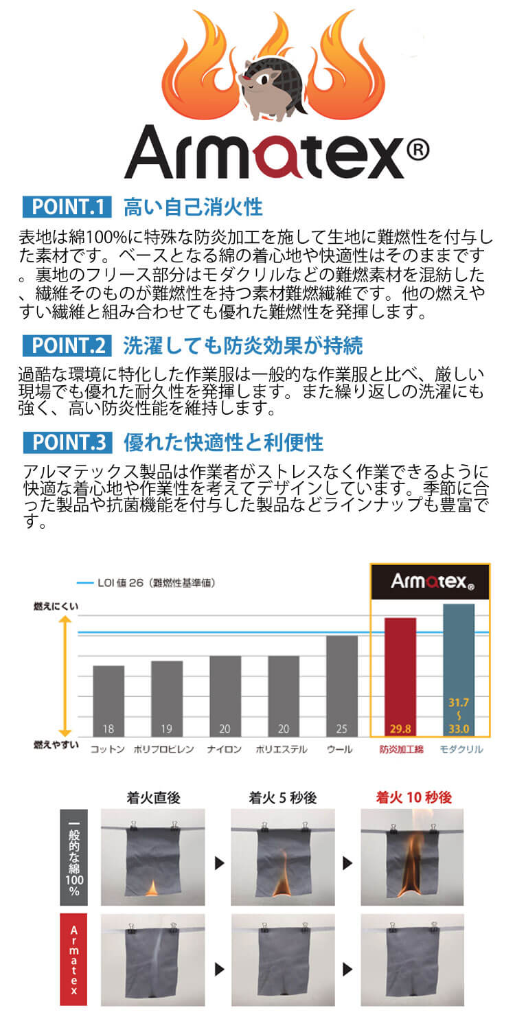 ・厳しい作業環境でも優れた耐久性を発揮し、繰り返しの洗濯後も高い防炎効果を維持