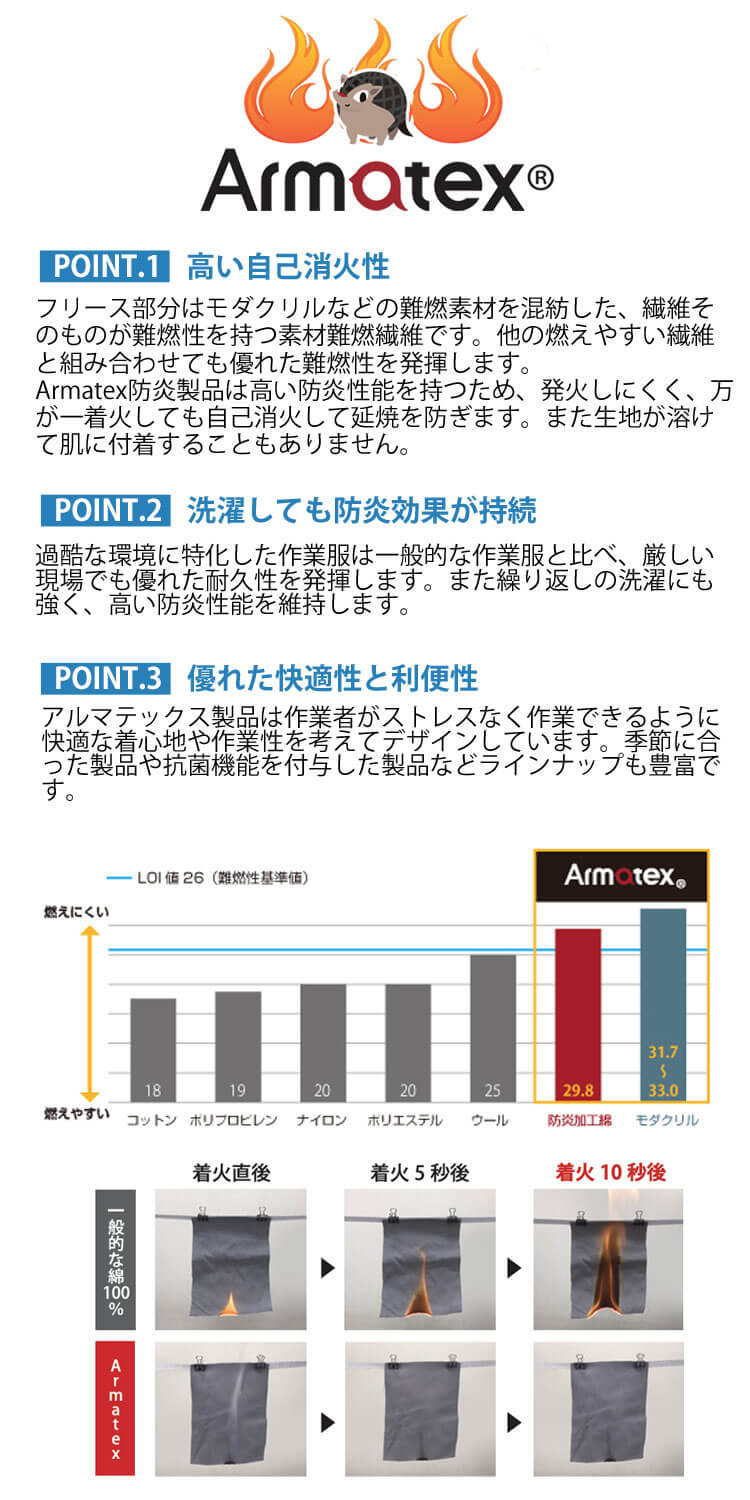 ・厳しい作業環境でも優れた耐久性を発揮し、繰り返しの洗濯後も高い防炎効果を維持