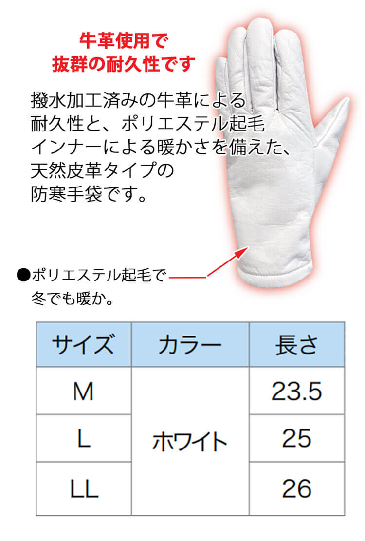 商品説明: 撥水加工済みの牛皮による耐久性と、ポリエステル起毛インナーによる暖かさを備えた、天然皮革タイプの防寒手袋です。牛革を使用しているため耐久性にも優れ、あったか起毛で冬でも安心の暖かさ。
